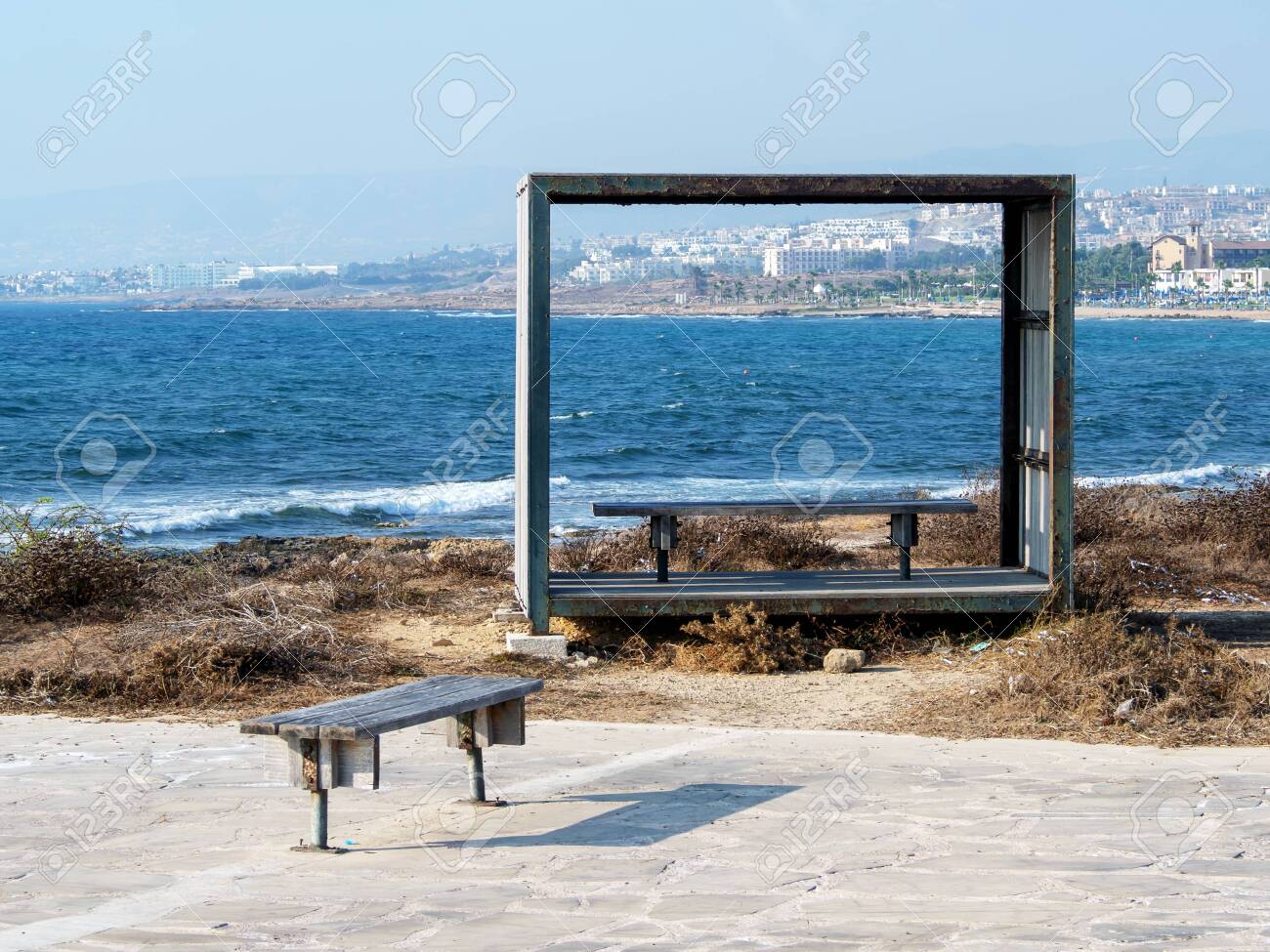 Sun Protection Wooden Bus Station On The Sea Beach Blue Bay