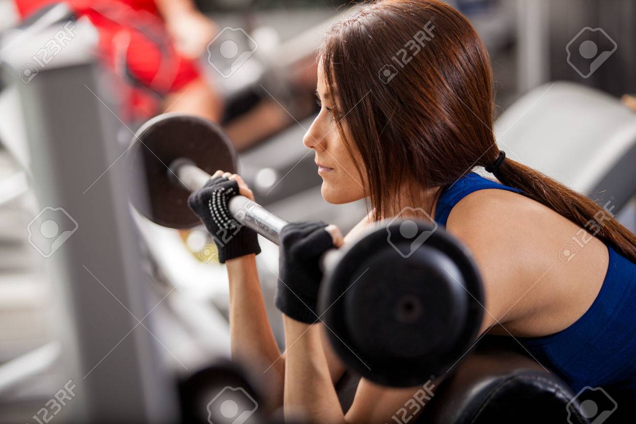Cute Young Woman Working Out By Doing Bicep Curls In A Bench