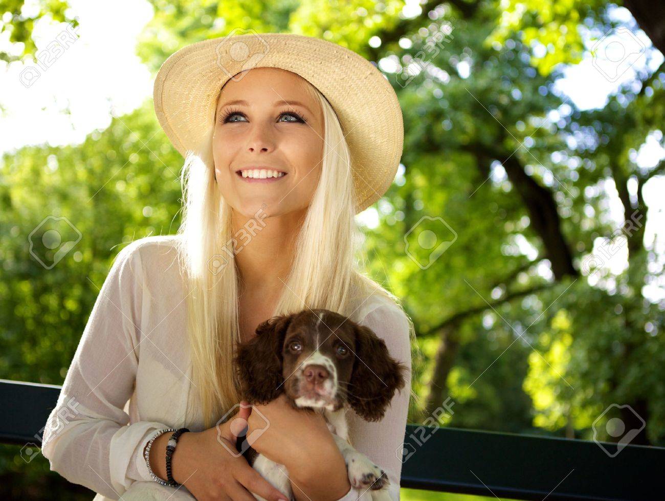 Cute Woman Holding A English Springer Spaniel Puppy In Her Arms