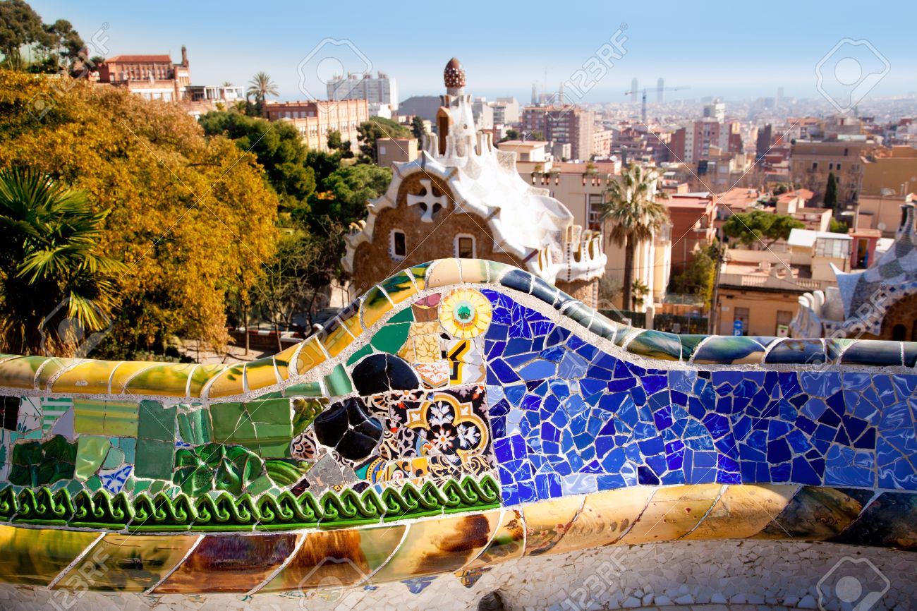 Gaudi Mosaic Bench Detail And Skyline Of Barcelona From Park Stock Photo Picture And Royalty Free Image Image 108674069