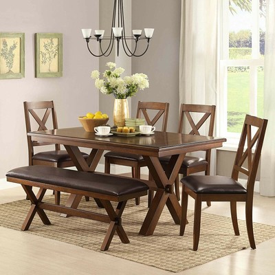 Rustic 6 Pc Dining Set Table Chairs Bench Padded Wood Brown